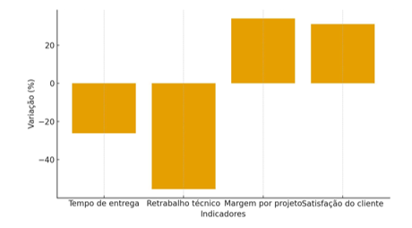 O quadro mostra que, após a integração, o tempo médio de entrega foi reduzido em aproximadamente vinte e seis por cento, enquanto o retrabalho técnico apresentou queda superior a cinquenta por cento. A margem de lucro por projeto aumentou significativamente, refletindo maior precisão na precificação e menor desperdício de materiais. A satisfação dos clientes também cresceu, atingindo média de nove vírgula três em uma escala de dez pontos.