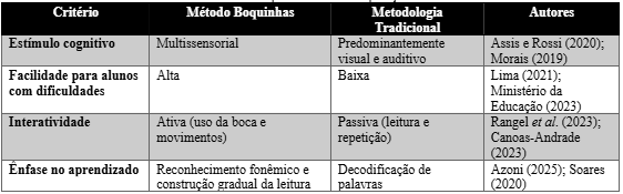 Outra análise importante da revisão bibliográfica foi a comparação entre o Método Boquinhas e abordagens convencionais de alfabetização. Segundo Lima (2021), métodos tradicionais muitas vezes enfatizam a decodificação sequencial das palavras, o que pode ser desafiador para crianças com dificuldades fonológicas.