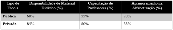 A revisão bibliográfica também abordou a implementação do Método Boquinhas em diversas realidades escolares. O estudo de Canoas-Andrade (2023) analisou sua eficácia em instituições públicas e privadas, indicando diferenças nos resultados devido ao acesso a materiais pedagógicos e capacitação docente. A tabela 4 apresenta um panorama das condições de aplicação do método em escolas de perfis distintos: