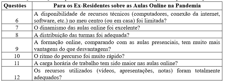 Quadro 1. Questões para os ex-residentes sobre as aulas online na pandemia por covid-19.