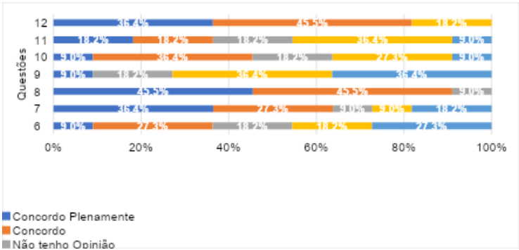 Os dados expressos no Questão 11 indicam que a maior parte dos ex-residentes, apontaram um empate com o mesmo percentual de 18,2% para aqueles que concordam plenamente, 18,2% que concordam e 18,2% ex-residentes que não tem opinião, se a carga horária de trabalho tem sido maior nas aulas online. Borba et al. (2020) destaca o acúmulo de tarefas que pode influenciar de modo negativo no processo de ensino e aprendizagem.