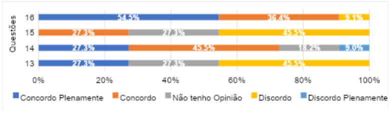 Ao analisar a Figura 2, a Questão 13 nos esclarece que o maior percentual de respostas dos ex-residentes com 45,5% discorda que os professores foram totalmente adaptados ao ensino online na pandemia por covid-19. Dessa forma, constatamos que na opinião da maioria dos ex-residentes acredita que os professores tiveram dificuldades no processo de adaptação. Contudo, ainda existem professores que tiveram uma experiência de aprendizagem on-line adaptada com sucesso e de acordo com os autores Marchak, Serebro e Blonder (2020, p. 1, tradução nossa) destacam “a eficácia do processo de adaptação e o impacto que o curso online pode ter tido sobre os professores”.