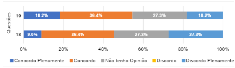 Ao analisar os dados da Questão 18 da Figura 4, mostram um maior percentual de respostas dos ex-residentes com 9,0% que concordam plenamente e 36,4% na qual concordam que os professores têm utilizado excelentes recursos para realizar uma aula prática virtual no laboratório na pandemia por covid-19.