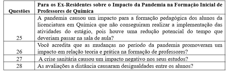 No contexto atual, com relação ao questionário online foram respondidas as seguintes Questões 25, 26, 27 e 28 (Quadro 4) sobre o impacto da pandemia na formação dos professores de química, com as respostas dos ex-residentes (participantes da edição 2020 a 2022) do curso de licenciatura de Química do IFPR/Campus de Paranavaí, portanto, levaram as discussões dos resultados encontrados no formato de resposta em escala Likert de 5 pontos.