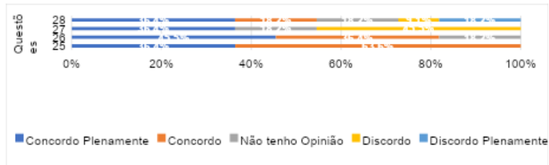 Ao analisar os dados da Figura 5, observamos na Questão 25 o maior percentual de respostas dos ex-residentes com 36,4% que concordam plenamente e 63,6% que concordam que a pandemia causou um impacto para a formação pedagógica dos alunos da licenciatura em Química que não conseguiram realizar a implementação das atividades do estágio, pois houve uma redução potencial do tempo que deveriam passar na sala de aula.
