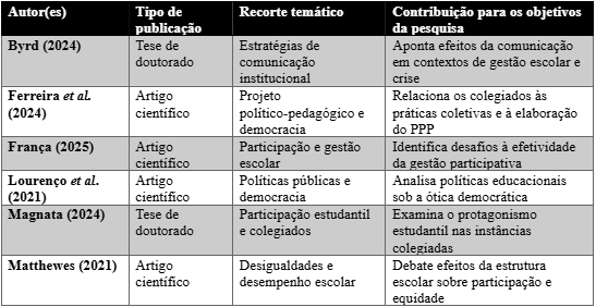 A atuação dos órgãos colegiados na escola pública tem sido abordada em múltiplas perspectivas, com crescente atenção às dimensões normativas, comunicacionais e organizacionais que influenciam sua efetividade no contexto da gestão democrática. Os estudos considerados nesta revisão oferecem contribuições que abrangem diferentes vertentes teóricas e metodológicas, permitindo o mapeamento de questões estruturais e práticas que afetam a consolidação da participação coletiva nas unidades escolares.