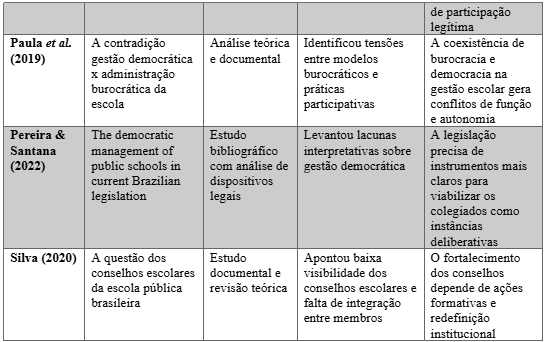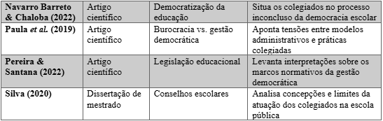 Tabela 2 –Revisão da literatura sobre gestão democrática e atuação dos órgãos colegiados