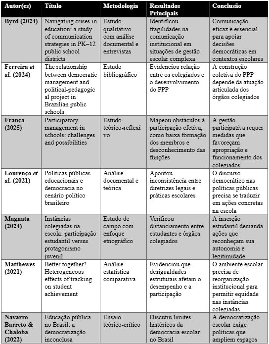 Desafios comunicacionais: As análises de Byrd (2024) e França (2025) destacam entraves na circulação de informações entre os sujeitos escolares, dificultando o engajamento coletivo e a transparência dos processos decisórios. Os estudos sugerem que a ausência de estratégias comunicacionais adequadas compromete a legitimidade da gestão democrática.