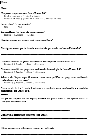 Para realização deste estudo foi, primeiramente, concluído um levantamento bibliográfico retrospectivo através de produções científicas disponíveis em bases de dados eletrônicas brasileiras, explorando qualitativamente as principais conceituações acerca da sustentabilidade, da comunidade e sociedade, bem como suas contextualidades no contexto histórico. Após, realizou-se a aplicação de uma entrevista com residentes locais do município de Lauro Freitas-BA, sob a forma de questionário (Apêndice A), visando identificar as relações consistentes entre o rio Sapato e a população local. Os dados foram analisados sob abordagem quantitativa e qualitativa, transcritos sob a forma de gráficos e tabelas, bem como dissertação textual.