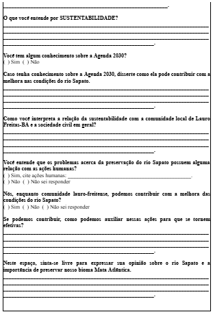 Este artículo es el cuarto fragmento de una secuencia de estudios científicos sobre el río Zapato, ubicado en el municipio de Lauro Freitas, Bahía. Previamente, se realizó un estudio en profundidad sobre las condiciones ambientales del curso de agua y los daños causados ​​a la fauna y flora local, impactando directamente el bioma de la Mata Atlántica y violando la legislación brasileña sobre preservación ambiental. En este estudio, el foco fue sacar a la luz la perspectiva de los populares lauro-freitenses sobre el estado actual del río Zapato, realizando una retrospectiva sobre los principales problemas responsables de la exacerbada y recurrente contaminación en el lugar. A través de una entrevista cara a cara, dirigida directamente a los vecinos del entorno del curso de agua, se constató insatisfacción, frustración y desánimo por el estado crítico en el que se encuentra el río Sapato, ya sea por falta de iniciativa de las Autoridades Públicas, o por acciones negligentes de vecinos de Lauro Freitas que contaminan indiscriminadamente. Se sienten perjudicados dentro de un ecosistema tan degradado, haciendo un llamado a la comunidad, sociedad y gobierno a buscar alternativas viables para promover el desarrollo sustentable en el municipio, comenzando por la limpieza y revitalización del río.