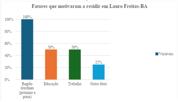 De acordo com o levantamento, os principais motivos que levaram os participantes a residirem no município de Lauro Freitas-BA, 100% deles assentem o fato de ser na região litorânea, “com presença de praia”, o que favorece o contato com a natureza e a vida menos urbanizada; 50% (n=2) citaram a facilidade de trabalho e acesso a educação como motivos; um participante citou a urgência durante o período pandêmico como fator motivador, correspondendo a 25%.