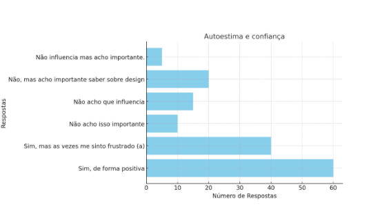 No que diz respeito à autoestima e à autoconfiança, a maioria afirmou perceber um impacto positivo das atividades de design e criação. No entanto, também surgiram relatos de frustração, o que indica que o processo criativo, embora enriquecedor, pode gerar inseguranças quando não há apoio adequado. Isso sugere a necessidade de mediação pedagógica sensível e consciente, capaz de transformar desafios criativos em aprendizados e fortalecimento pessoal.