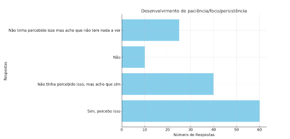 Em relação as habilidades de Foco, Paciência e Persistência, vários relatos apontam para o desenvolvimento de habilidades comportamentais importantes, como concentração, persistência e paciência. Aprendi a ter mais paciência e foco quando estou criando algo; Eu sinto que fico muito mais focado quando eu tento desenhar.