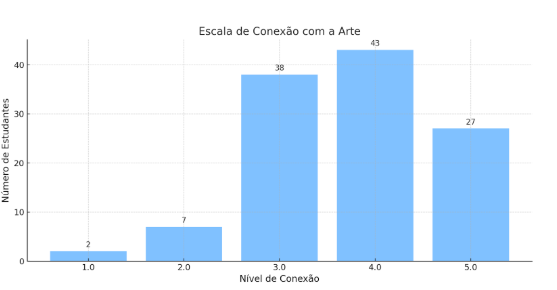 Por fim, chama atenção a autopercepção dos estudantes em relação à sua conexão com a arte e o design: a maioria se autoavalia com pontuações altas (níveis 4 e 5 em uma escala de 1 a 5), demonstrando forte vínculo afetivo e criativo com essas áreas. Esse dado reforça a importância de se investir em projetos, oficinas e currículos que aproveitem essa conexão como base para a aprendizagem significativa e o protagonismo juvenil.