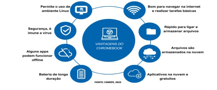 Os Chromebooks são notebooks que executam o sistema operacional Chrome OS, desenvolvido pelo Google. Eles têm algumas vantagens distintas em comparação com notebooks tradicionais que usam sistemas operacionais como Windows ou MacOS. Aqui estão algumas das vantagens dos Chromebooks: Os professores podem aproveitar bem o Chromebook, pois ajuda a otimizar o tempo e o trabalho, antes, durante e depois das aulas. Além disso, ele apresenta a possibilidade de tornar o estudante produtor de conhecimento e não apenas um consumidor (Ferreira; Silva; Gomes, 2023).