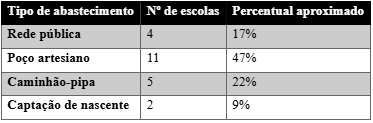 Tabela 2 – Modalidades de abastecimento de água em escolas municipais do 4º distrito