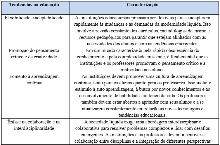 Diante da sociedade líquida, as instituições educacionais e os professores enfrentam desafios significativos que demandam uma abordagem adaptativa e flexível. O quadro 1 apresenta algumas orientações sobre como as instituições e os professores podem se comportar diante desse contexto.