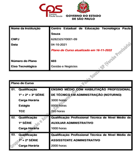CPS. Plano de Curso Ensino Médio com Habilitação Profissional de Técnico em Administração (Noturno). Centro Paula Souza. Governo do Estado de São Paulo, 2022. Disponível em: https://www.etecsjcampos.com.br/ planos-de-curso/446da8571fd856b743