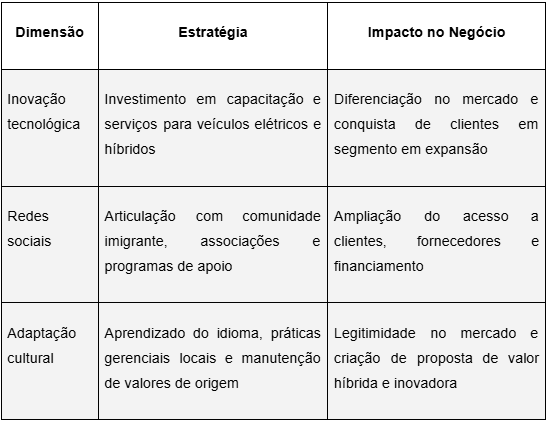 A experiência do imigrante brasileiro no setor automotivo norte-americano revelou um conjunto de estratégias de resiliência que permitiram não apenas a sobrevivência do empreendimento, mas também sua consolidação em um mercado altamente competitivo. Essas estratégias se materializaram em três dimensões principais: inovação tecnológica, construção de redes sociais e adaptação cultural.