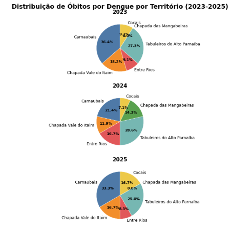 A Figura 2 mostra a distribuição de óbitos por dengue (gráfico de pizza para totais anuais por território).