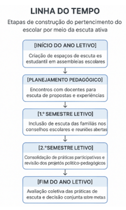 A linha do tempo proposta acima sintetiza o processo progressivo de construção do pertencimento escolar por meio da escuta ativa. No início do ano letivo, a abertura para escutar os estudantes nas assembleias representa uma quebra de paradigmas tradicionais, conforme sugerido por Laval e Vergne (2024), que veem a escola como espaço em disputa simbólica e política. Ao longo do semestre, esse movimento se amplia com a escuta dos professores e familiares, constituindo redes de compromisso e diálogo.