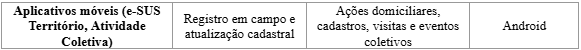 No que se refere aos aplicativos móveis, destacam-se o e-SUS Território e o Atividade Coletiva, voltados ao registro de ações em campo, especialmente aquelas realizadas por Agentes Comunitários de Saúde e profissionais de enfermagem. Esses aplicativos viabilizam o cadastramento domiciliar, o acompanhamento de famílias vulneráveis e o lançamento de ações coletivas diretamente no sistema, integrando-se posteriormente ao SISAB. Eles ampliam a capilaridade dos registros, possibilitando maior tempestividade e precisão das informações territoriais (Silva et al., 2024; Zinader, 2022). A portabilidade e a conectividade com os sistemas centrais consolidam essas ferramentas como vetores de inovação na prática da APS.