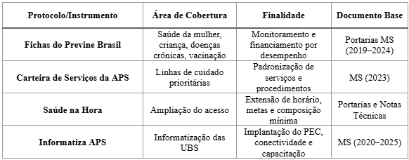 Quanto aos protocolos institucionais, observou-se predominância das fichas do Previne Brasil, da Carteira de Serviços da APS e das normativas vinculadas aos programas Saúde na Hora e Informatiza APS. Tais instrumentos normativos atuam na padronização de práticas assistenciais, no estabelecimento de metas e na operacionalização de políticas de incentivo financeiro com base em desempenho. O Quadro 2 organiza os protocolos mais recorrentes e suas respectivas áreas de cobertura assistencial.