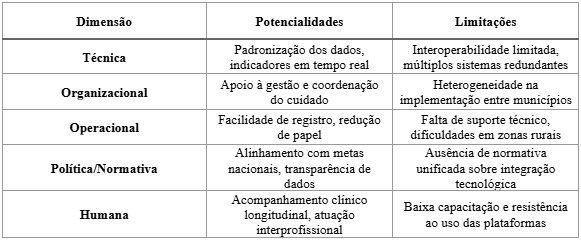 Entretanto, foram também identificadas importantes limitações. Em especial, a heterogeneidade da infraestrutura tecnológica entre os municípios compromete a universalização da informatização. A falta de interoperabilidade entre sistemas estaduais e municipais, bem como a escassa capacitação continuada dos profissionais, foram apontadas como obstáculos recorrentes. O Quadro 3 sintetiza as principais potencialidades e limitações observadas durante a análise documental.