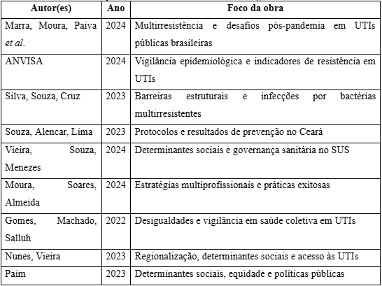 O presente artigo caracteriza-se como um estudo qualitativo de abordagem analítica, fundamentado em revisão bibliográfica integrativa. O objetivo central foi identificar e sintetizar as principais contribuições teóricas e empíricas publicadas entre 2022 e 2025 acerca dos determinantes sociais e epidemiológicos das infecções por bactérias multirresistentes em UTIs brasileiras, com ênfase nos desafios enfrentados pela vigilância em saúde coletiva no contexto pós-pandemia.