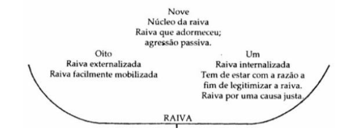 Os tipos do Eneagrama, se dividem por eixos centrais, onde temos sentimentos atribuídos e dominantes no primeiro eixo ou quadrante temos a raiva, onde os impulsos principais são com base na explosão da raiva como no tipo oito, contenção da raiva como tipo um e a mobilização pela raiva como o tipo nove (Palmer, 1993).