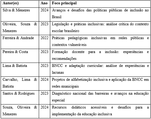 Destaca-se como limitação a restrição da análise a obras publicadas entre 2022 e 2025, o que pode ter excluído experiências inovadoras em fase inicial ou em contextos menos documentados. Recomenda-se, portanto, o aprofundamento de estudos empíricos que acompanhem a implementação de práticas inclusivas em diferentes regiões e etapas de ensino.