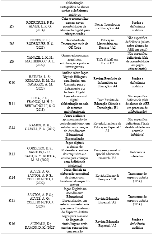 Os resultados mostram que a maioria dos estudos foca em alunos com surdez/deficiência auditiva (25%), seguidos por aqueles com Transtorno do Espectro Autista (20,8%) e deficiências diversas ou não especificadas (20,8%). As temáticas mais recorrentes foram Alfabetização e Comunicação e Desenvolvimento de Habilidades Cognitivas e Sociais (25% cada), destacando o uso dos jogos digitais no apoio à leitura, escrita e habilidades socioemocionais. As pesquisas evidenciam seu potencial inclusivo, mas também desafios como escassez de jogos acessíveis, formação docente insuficiente e dificuldade de adaptação curricular. Reforça-se a importância de políticas públicas e parcerias para ampliar seu uso no AEE.