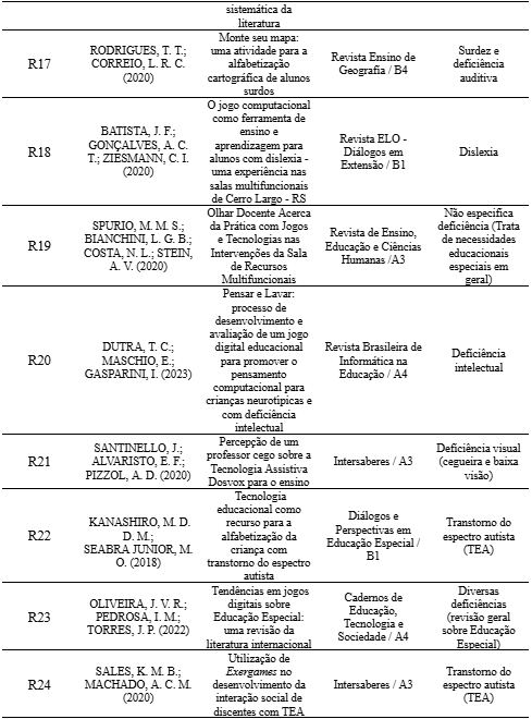 Tabela 1 – Autoria e ano, título, nome e Qualis do periódico de publicação e tipo de deficiência dos 24 registros que atenderam aos critérios de inclusão.