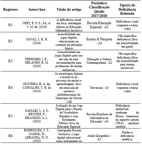 Foram extraídos: autor/ano, título, periódico/Qualis CAPES (2017-2020), tipo de deficiência e área temática da pesquisa de acordo com o foco central de suas investigações (Alfabetização e Comunicação; Acessibilidade e Tecnologia Assistiva; Desenvolvimento de Habilidades Cognitivas e Sociais; Ensino da Matemática e Raciocínio Lógico; Letramento Digital; Uso da Libras/Bilinguismo; Desenvolvimento de Funções Executivas (Controle Inibitório); e Outros (abrangendo estudos de caráter geral sobre jogos digitais no AEE.