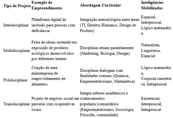 Em contraponto, autores como Edgar Morin (2000; 2003), José Moran (2015) e Philippe Perrenoud (2000) fundamentam a necessidade de reorganizar o currículo escolar sob a lógica da complexidade, da aprendizagem significativa e da prática pedagógica baseada em projetos. Essa perspectiva se materializa na construção de dispositivos formativos que articulam diferentes campos do saber e mobilizam múltiplas inteligências, como ilustrado a seguir.
