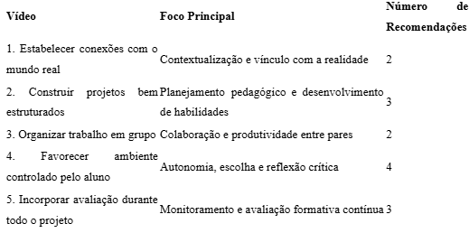 O quadro acima sintetiza os principais enfoques dos vídeos propostos por José Moran, os quais dialogam diretamente com os princípios defendidos neste artigo para a construção de um currículo integrado na educação técnica, ao promoverem práticas pedagógicas que articulam autonomia, contextualização, colaboração e avaliação contínua sobre aprendizagem baseada em projetos. Observa-se que o maior número de recomendações está concentrado no vídeo 4, que trata da autonomia e do protagonismo discente. Esse destaque evidencia a importância de criar ambientes flexíveis e centrados no aluno como condição para o desenvolvimento pleno das competências cognitivas, sociais e afetivas.