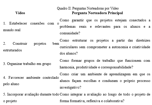 É nesse sentido que os vídeos do canal Edutopia, traduzidos por José Moran, oferecem diretrizes fundamentais para a aprendizagem baseada em projetos. As perguntas norteadoras extraídas desses materiais funcionam como critérios de planejamento, execução e avaliação, permitindo ao docente estruturar sua prática com foco na formação integral.
