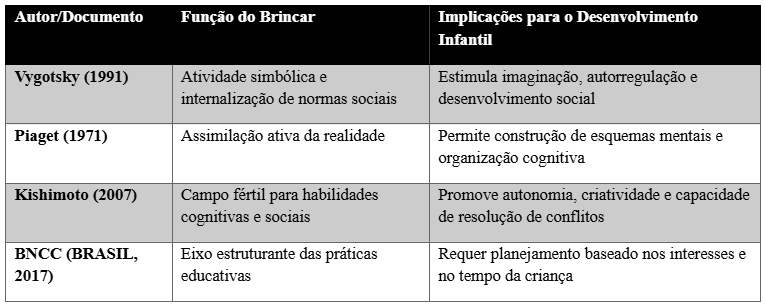 A análise dessas concepções é sintetizada na Tabela 1, que apresenta as principais funções formativas do brincar, com destaque para suas implicações no processo de desenvolvimento infantil.