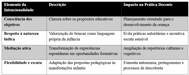 Essa concepção é detalhada na Tabela 2, que apresenta os elementos constitutivos da intencionalidade pedagógica e seus efeitos sobre a prática docente na educação infantil.