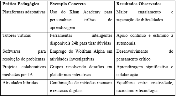 A análise dos textos selecionados evidencia que a integração da inteligência artificial no ensino de matemática vem proporcionando avanços significativos, especialmente no que diz respeito à personalização do aprendizado e ao aumento da autonomia dos estudantes. Entre as práticas pedagógicas mais recorrentes destacam-se o uso de plataformas adaptativas, como Khan Academy, que permitem o acompanhamento individualizado do progresso de cada aluno e a aplicação de atividades que se ajustam ao ritmo e às dificuldades identificadas em tempo real.