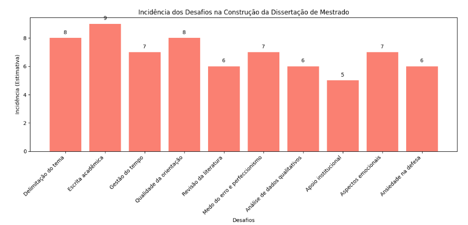 Os maiores desafios na elaboração da dissertação de mestrado estão relacionados à escrita acadêmica, definição do tema e qualidade da orientação, com incidências de 9 e 8 respectivamente. Esses dados indicam que os estudantes enfrentam dificuldades tanto na estruturação do conteúdo quanto na condução do trabalho com seus orientadores. Além disso, aspectos emocionais e a gestão do tempo também se destacam, sugerindo que o processo de escrita é permeado por tensões psicológicas e limitações organizacionais. A baixa incidência de apoio institucional (5) revela uma lacuna importante no suporte oferecido pelas instituições de ensino. Em conjunto, os dados apontam para a necessidade de ações integradas que envolvam capacitação em escrita, orientação qualificada, suporte emocional e institucional. Tais medidas podem contribuir significativamente para a superação dos obstáculos e para o sucesso acadêmico dos mestrandos.
