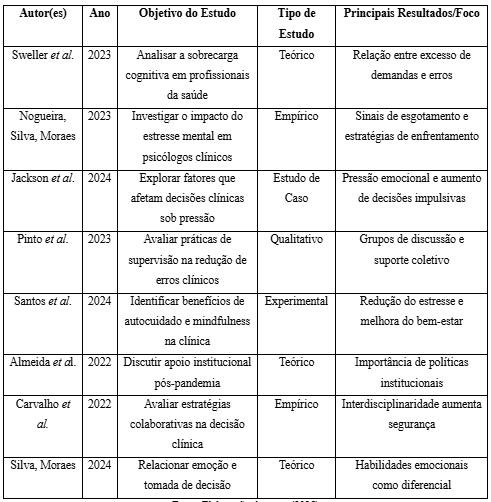 A análise dos estudos selecionados revelou evidências consistentes de que a sobrecarga cognitiva e o estresse mental são fatores recorrentes na prática de psicólogos clínicos, com impactos diretos tanto sobre o processo de tomada de decisão quanto sobre o bem-estar desses profissionais. Os dados extraídos e organizados na Tabela 1 indicam que estratégias de suporte institucional, supervisão clínica e o uso de metodologias colaborativas têm se mostrado eficazes para a prevenção do esgotamento e a promoção de práticas mais seguras e reflexivas.