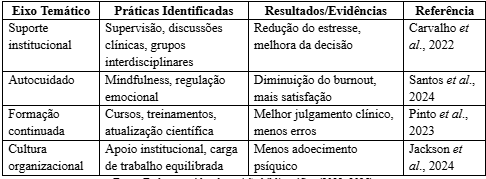 Verificou-se que o estresse mental e a sobrecarga cognitiva afetam significativamente o processo decisório, podendo comprometer a eficácia das intervenções clínicas e a segurança do paciente. Nesse sentido, práticas como supervisão clínica, grupos de discussão, programas de autocuidado e apoio institucional mostraram-se relevantes para mitigar tais impactos e promover maior equilíbrio emocional e profissional.
