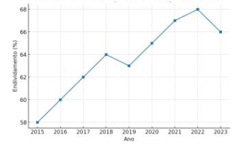 A Figura 2 mostra que o nível médio de endividamento manteve tendência ascendente até 2021, ultrapassando 65% do total de ativos, o que amplia a exposição das empresas a riscos financeiros. Ross, Westerfield e Jaffe (2019) defendem que o ponto ótimo de alavancagem deve equilibrar os benefícios fiscais da dívida com os custos associados ao risco de falência.