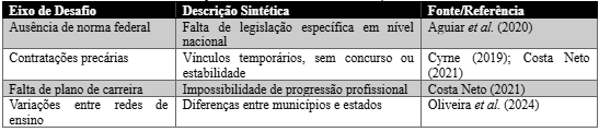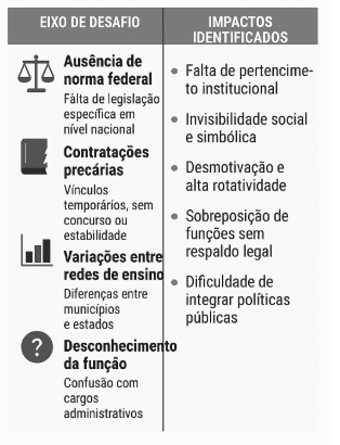 A convergência das fontes analisadas revela esforços pontuais em estados e municípios que tentam incorporar esses profissionais às políticas locais de valorização, mas sem articulação com uma política nacional consolidada. Autores como Costa Neto (2021), Cyrne (2019) e Aguiar et al. (2020) apontam que a ausência de diretrizes federais gera uma sobreposição de nomenclaturas e funções, dificultando o reconhecimento profissional e institucional. Tal cenário reafirma a urgência de estabelecer normativas claras e integradas no campo educacional.