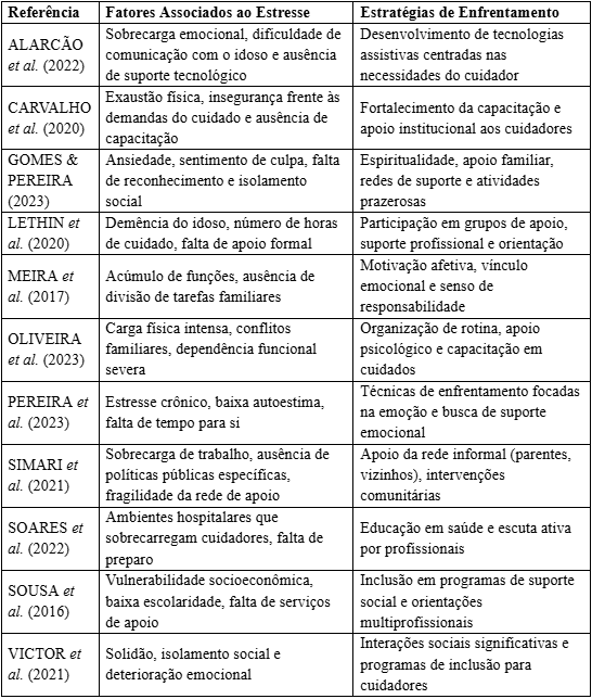 O estresse em cuidadores familiares de idosos é uma condição multifatorial, resultado da combinação de aspectos físicos, emocionais, sociais e econômicos. A literatura analisada aponta que os principais fatores associados ao estresse incluem a intensidade das demandas de cuidado, o tempo prolongado dedicado à função, a falta de apoio social, a presença de sintomas neuropsiquiátricos no idoso, e a ausência de preparo técnico do cuidador (Lethin et al., 2020). Estudos demonstram que a sobrecarga emocional é frequentemente agravada quando o cuidador assume, sozinho, a responsabilidade pelo cuidado contínuo, especialmente em casos de demência ou dependência funcional severa. Além disso, a falta de lazer, de tempo para si e o isolamento social também estão entre os fatores mais recorrentes associados ao desgaste físico e psicológico dos cuidadores (Simari et al., 2021). Outro elemento identificado é a influência dos aspectos culturais e emocionais no processo de cuidado. Em algumas culturas, o cuidado é percebido como um dever moral ou afetivo, o que, embora nobre, pode dificultar o reconhecimento dos próprios limites e a busca por ajuda (Carvalho et al., 2020). A baixa escolaridade e a renda limitada também aparecem como agravantes, por dificultarem o acesso a serviços de apoio, informações e capacitação (Soares et al., 2022).