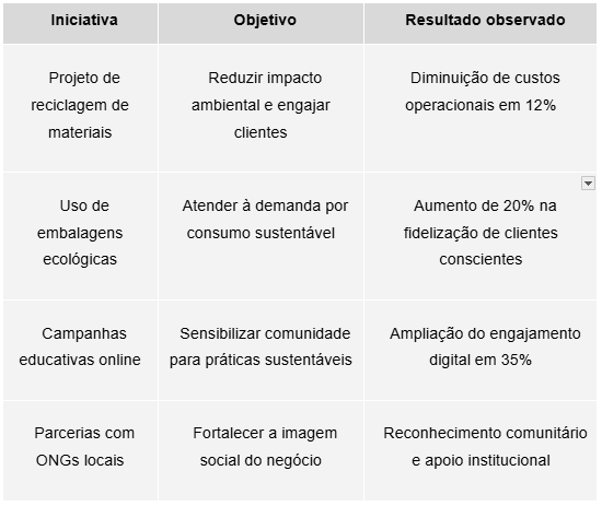 A pesquisa também identificou iniciativas de caráter sustentável, como projetos de reciclagem, conservação e gestão ambiental, integrados às práticas comerciais. Essas ações não apenas reforçaram a imagem da marca, mas também ampliaram sua aceitação junto a consumidores conscientes.