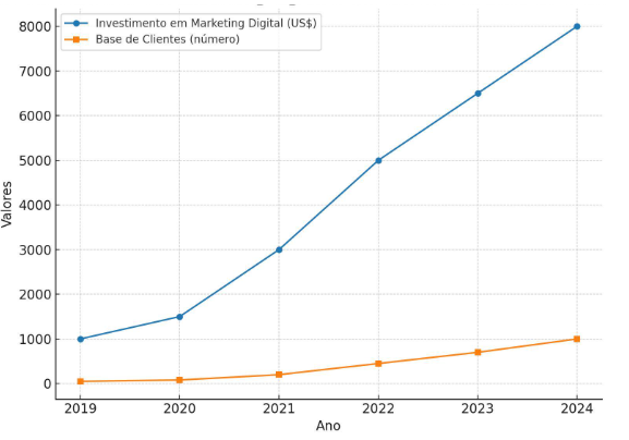 Gráfico 1 – Evolução do investimento em marketing digital e crescimento da base de clientes (2019–2024)