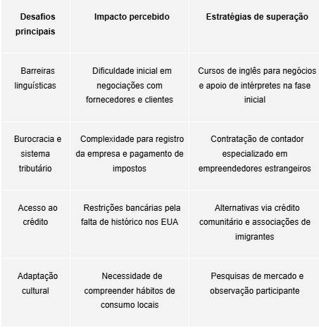 Tabela 1 – Principais desafios enfrentados por microempreendedores brasileiros nos EUA (caso estudado)