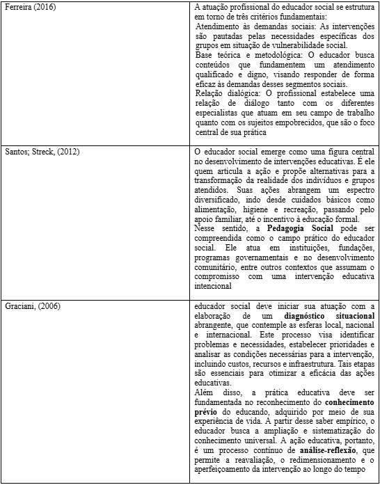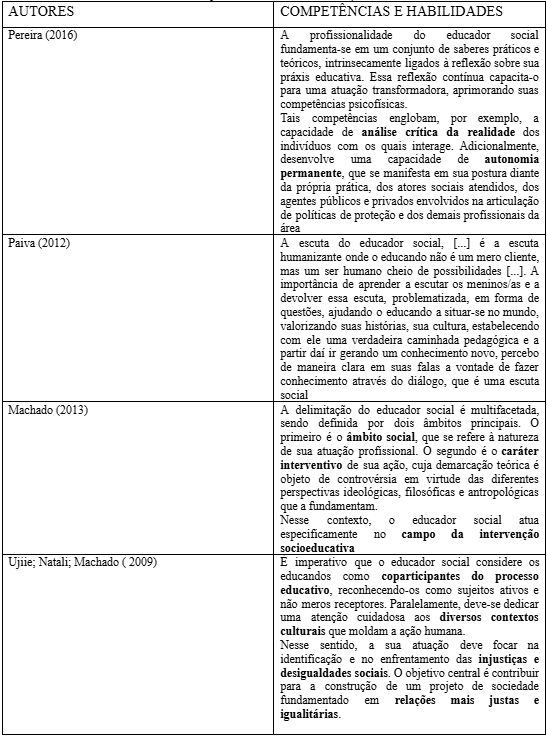 No caso do educador social, sua profissionalidade também gira em torno de saberes sobre o fazer e o pensar determinado pela reflexão da prática educativa, que o qualifica para uma atuação transformadora, desenvolvendo nele competências psicofísicas, como, por exemplo, a capacidade de análise e crítica da realidade dos atores sociais que ele atende, ou ainda a capacidade de autonomização permanente em relação a sua prática, aos atores, aos agentes públicos e privados que articulam políticas de proteção, aos colegas de profissão, dentre outros.” (Pereira, 2016, p. 1302).